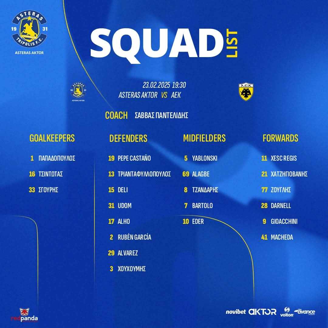 Με δύο σημαντικές απουσίες θα παραταχθεί ο Asteras Aktor στην αναμέτρηση (23/2, 19:30) με την ΑΕΚ για την 24η αγωνιστική της Stoiximan Super League.