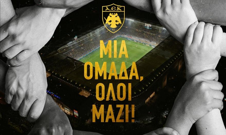 «Μια Ομάδα, Όλοι Μαζί. Με τη σέντρα του Πρωταθλήματος, η ΠΑΕ ΑΕΚ ανανεώνει τη δέσμευσή της: Κάθε φίλαθλος, ανεξάρτητα από φύλο, ηλικία, καταγωγή ή δυνατότητες, έχει θέση στο γήπεδο. Το ποδόσφαιρο είναι γιορτή για όλους. Η φωνή μας ενώνεται ενάντια σε κάθε διάκριση και αποκλεισμό. Η νέα χρονιά ξεκινά με πάθος, αλλά και με ευθύνη, να κρατήσουμε ζωντανό το δικαίωμα όλων να μοιράζονται τη χαρά του ποδοσφαίρου».