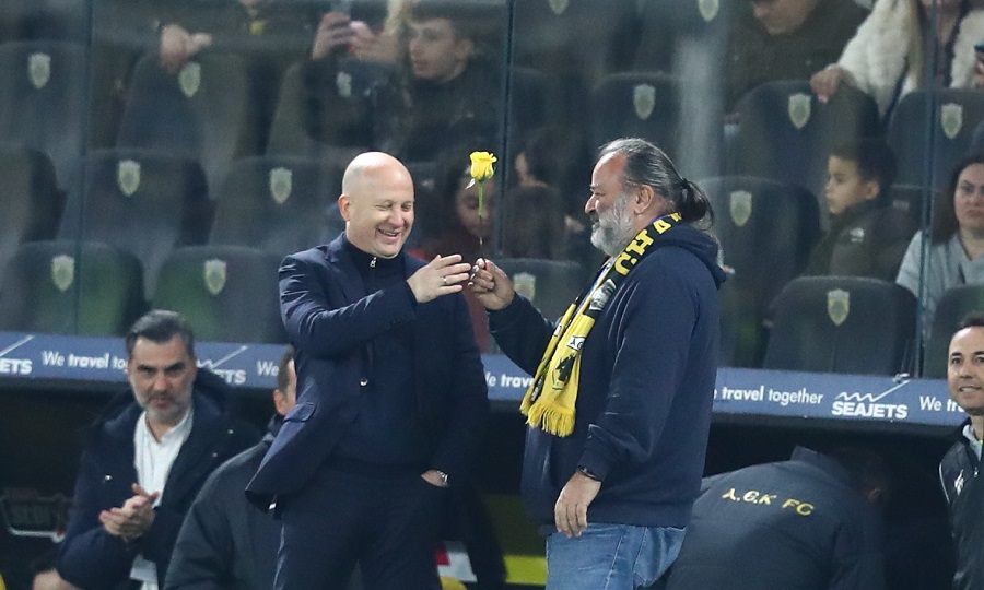 Όπως συνηθίζει, ο ιδιοκτήτης της Ένωσης Μάριος Ηλιόπουλος κατέβηκε στον αγωνιστικό χώρο μετά το τελευταίο σφύριγμα της αναμέτρησης για να συγχαρεί τους παίκτες και τον Μάρκο Νίκολιτς, στον οποίο έδωσε ένα κίτρινο τριαντάφυλλο.