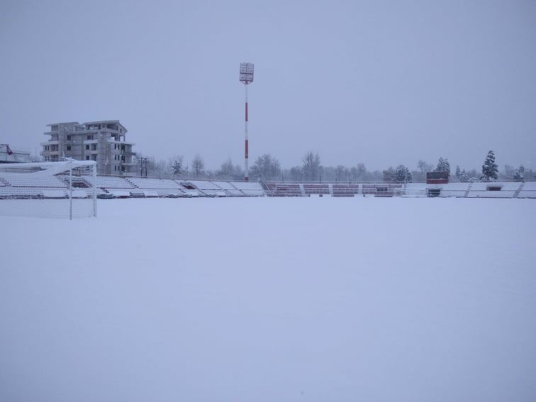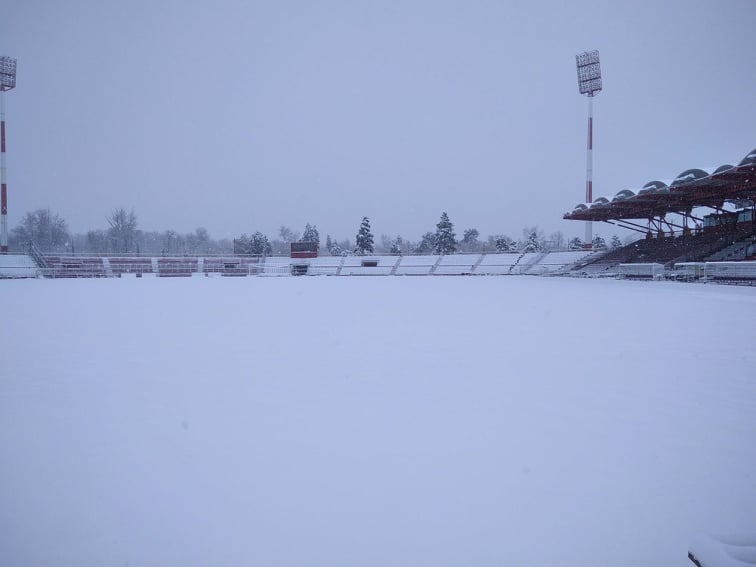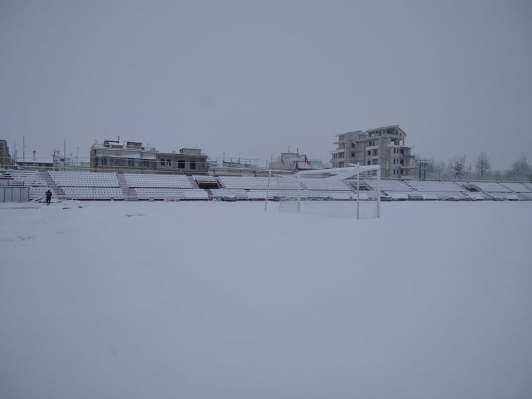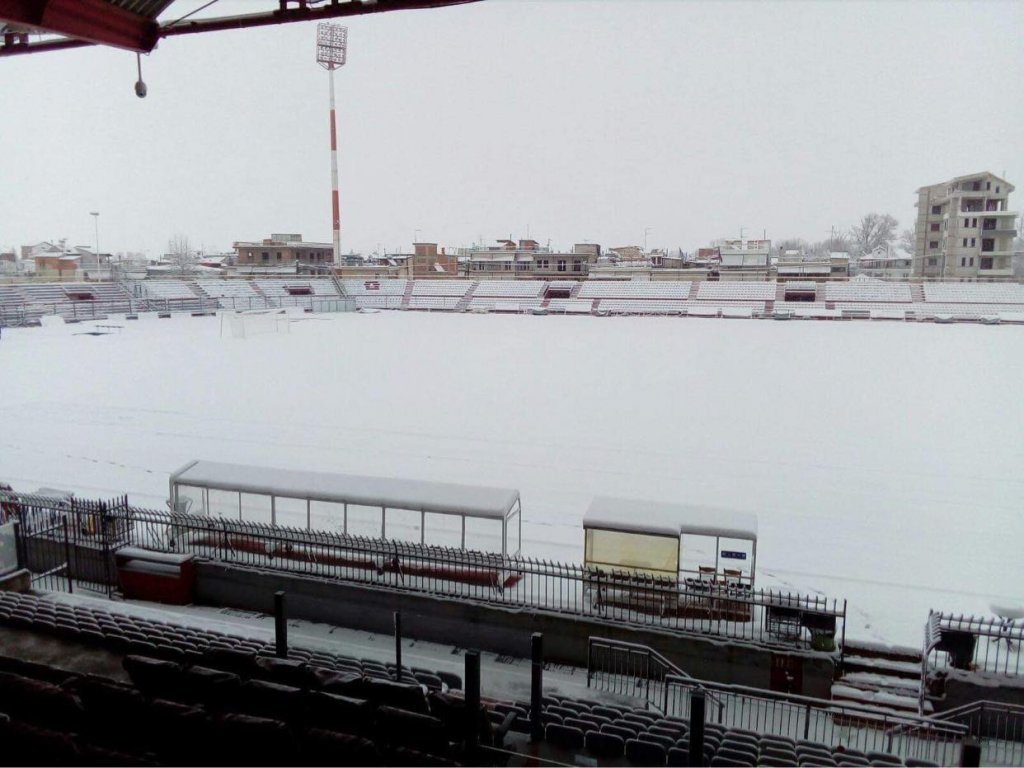 Το γήπεδο των «βυσσινί» έχει σκεπαστεί από χιόνι, γεγονός που ενδέχεται να οδηγήσει στην αναβολή της αναμέτρησης.