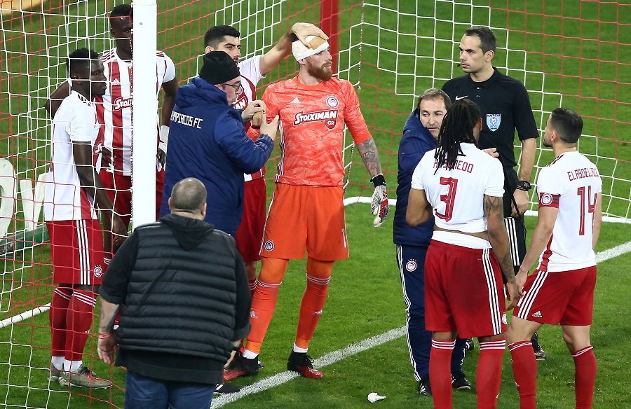 Ο τερματοφύλακας των Πειραιωτών έμεινε για αρκετά λεπτά στο έδαφος, τοποθετήθηκε και επίδεσμος στο κεφάλι και συνέχισε στο παιχνίδι. Για καλό και για κακό έκανε προθέρμανση ο Τζολάκης. Ο Γάλλος άσος τιμωρήθηκε μόνο με κίτρινη.