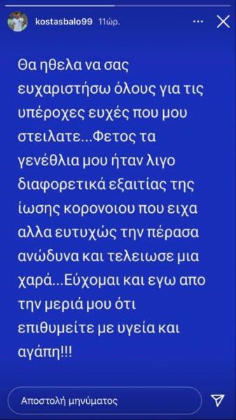 Θετικός στον κορωνοϊό βρέθηκε το προηγούμενο διάστημα ο Κωνσταντίνος Μπαλογιάννης. Απαντώντας σε ευχές για τα γενέθλιά του μέσω του instagram, ο άσος του ΟΦΗ αποκάλυψε ότι πέρασε κι εκείνος την περιπέτεια.