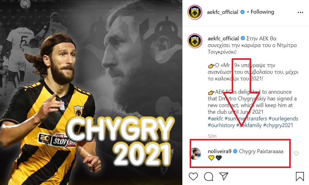 Κάτω από την ανάρτηση της κιτρινόμαυρης ΠΑΕ στο Instagram ο Πορτογάλος φορ έγραψε στα greeklish «Τσίγκρι παικταρά!».