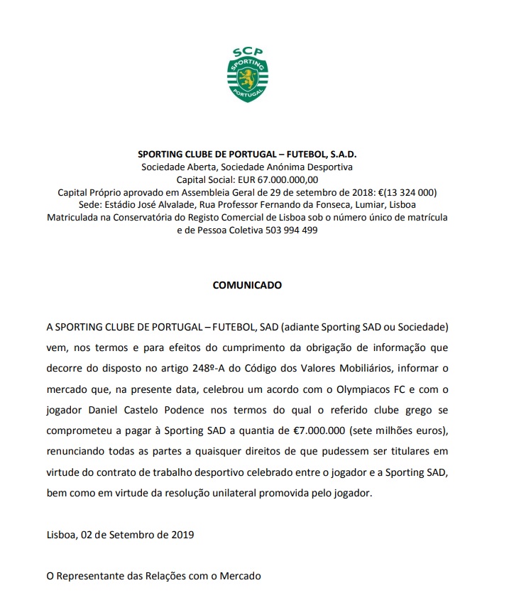 Αν και αρχικά υπήρχε η πληροφορία ότι το deal των δύο πλευρών θα ανερχόταν στα πέντε εκατομμύρια ευρώ, τελικά η πορτογαλική ομάδα ανακοίνωσε ότι ήρθε σε εξωδικαστική συμφωνία με τους ερυθρόλευκους με επτά εκατομμύρια ευρώ.