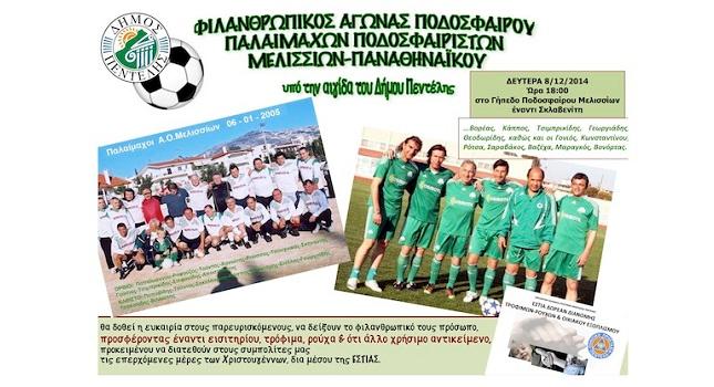 Υπό την Αιγίδα του Δήμου Πεντέλης θα πραγματοποιηθεί Φιλανθρωπικός Αγώνας Ποδοσφαίρου στις 8 Δεκεμβρίου 2014 ημέρα Δευτέρα και ώρα 6.00μ.μ. μεταξύ των Παλαίμαχων ποδοσφαιριστών της ομάδας των ΜΕΛΙΣΣΙΩΝ και του ΠΑΝΑΘΗΝΑΙΚΟΥ, στο Γήπεδο Ποδοσφαίρου Μελισσσίων (έναντι super market Σκλαβενίτης).