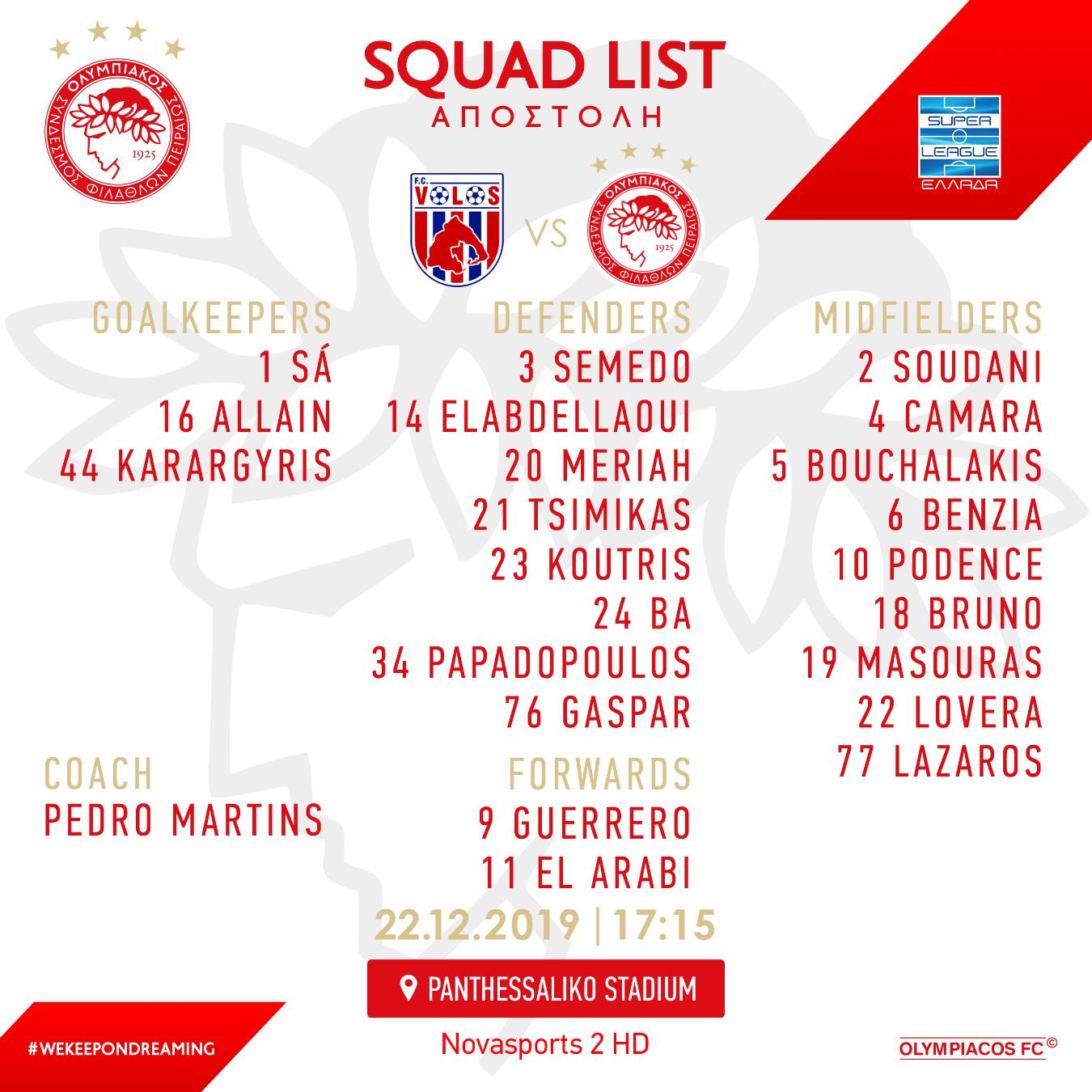 Η αποστολή του Ολυμπιακού για το ματς με τον ΝΠΣ Βόλο.