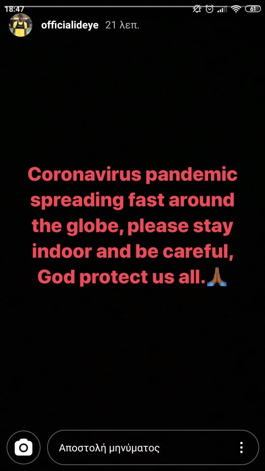 «Η πανδημία του κορωναϊού εξαπλώνεται πολύ γοργά σε όλον τον κόσμο, σας παρακαλώ μείνετε μέσα και προσέχετε. Ο Θεός μας προστατεύει όλους», έγραψε ο Νιγηριανός επιθετικός στο Instagram.