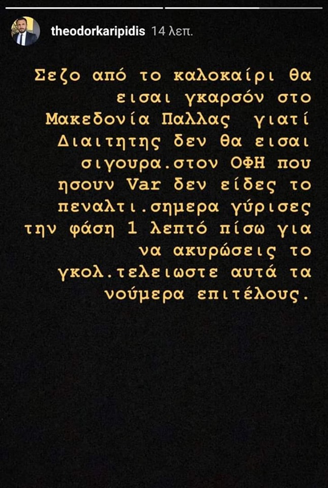 «Σέζο, από το καλοκαίρι θα είσαι γκαρσόν στο Μακεδονία Παλλάς γιατί διαιτητής δεν θα είσαι σίγουρα. Στον ΟΦΗ που ήσουν VAR δεν είδες το πέναλτι. Σήμερα γύρισες τη φάση 1 λεπτό πίσω για να ακυρώσεις το γκολ. Τελειώστε αυτά τα νούμερα επιτέλους», αναφέρει ο ισχυρός άνδρας των «κιτρινόμαυρων».