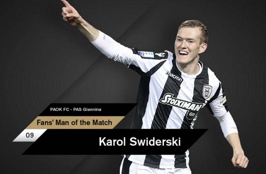 Ο Κάρολ Σφιντέρσκι αναδείχθηκε από το κοινό του paokfc.gr και του PAOK FC Official App, ως ο Fans’ Man of the Match της αναμέτρησης κόντρα στον ΠΑΣ Γιάννινα στο γήπεδο της Τούμπας για την 15η αγωνιστική της Super League Σουρωτή.