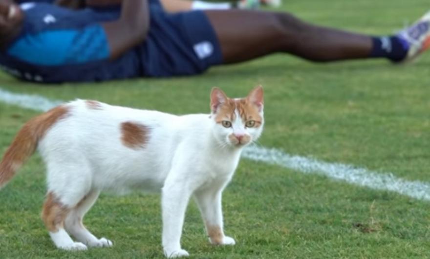 Το συμπαθές τετράποδο έλαβε μάλιστα και τα χάδια του από τον Χουχούμη, με το πλατύ χαμόγελο του Τετέι στη θέα του γατιού να τα λέει όλα...