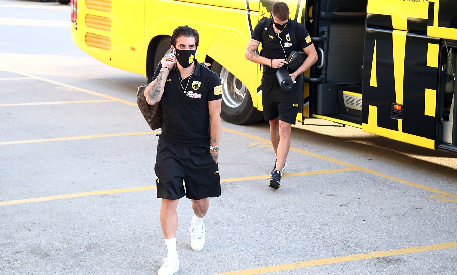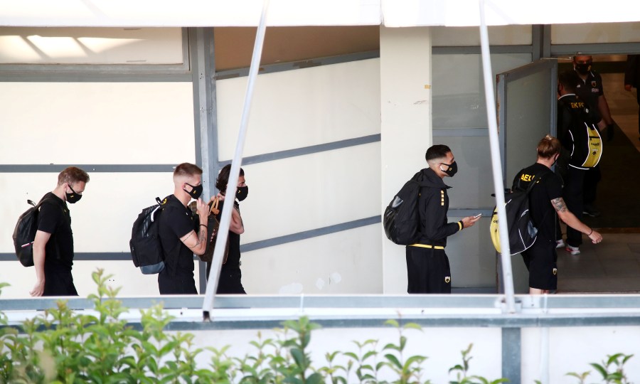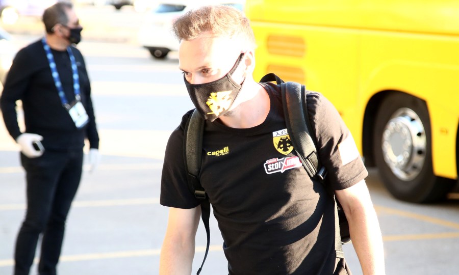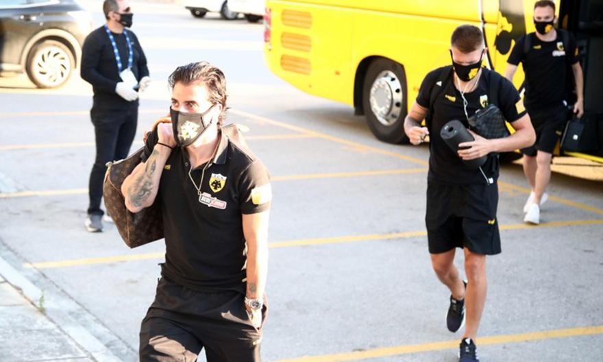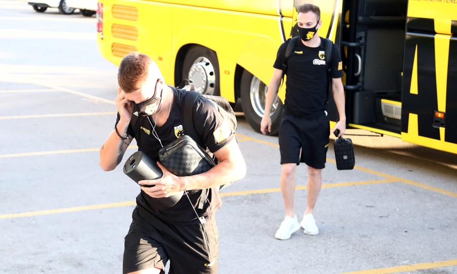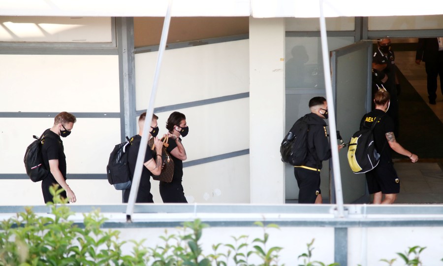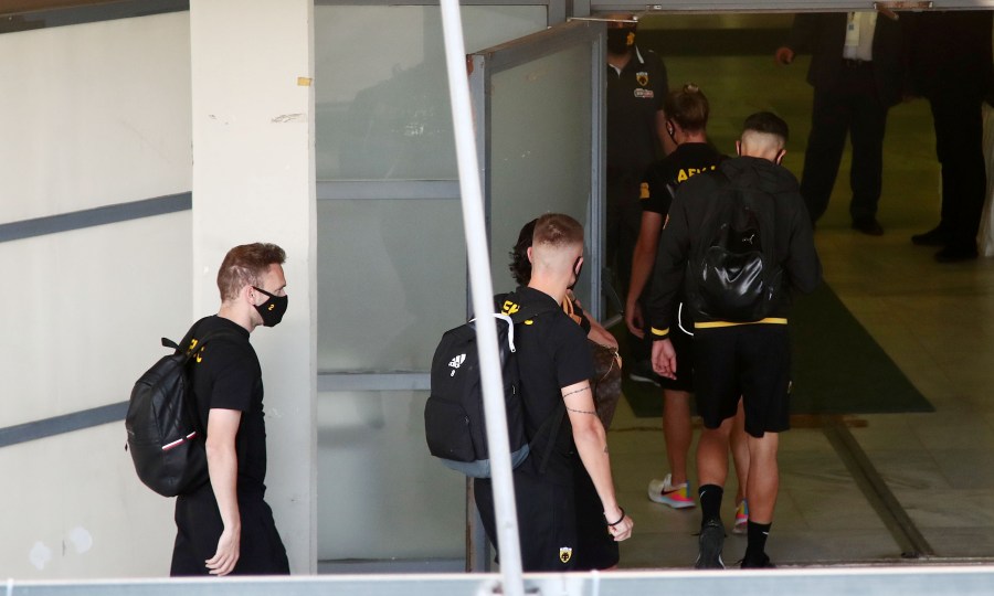 Φορώντας μάσκες και τηρώντας όλα τα απαραίτητα μέτρα ασφαλείας έφτασαν στο ΟΑΚΑ οι παίκτες της ΑΕΚ, για το ντέρμπι με τον Παναθηναϊκό.