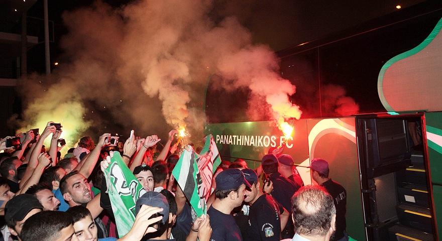 Με το γνωστό σύνθημα «πρωταθλητή σε θέλουμε Παναθηναϊκέ» και ανάβοντας πολλά καπνογόνα, οι φίλοι της ομάδας δημιούργησαν φανταστική ατμόσφαιρα, που έγινε… καυτή όταν βγήκε από το πούλμαν ο Μάρκους Μπεργκ, ο οποίος ανανέωσε χθες (22/9) το συμβόλαιό του.