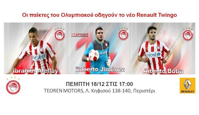 Οι αγαπημένοι σας παίκτες Ρομπέρτο Χιμένες, Αλμπέρτο Μποτία και Ιμπραήμ Αφελάι σας περιμένουν την Πέμπτη 18 Δεκεμβρίου στις 17:00, στις κεντρικές εγκαταστάσεις της TEOREN MOTORS στη Λεωφ. Κηφισού 138-140 για να γνωρίσετε από κοντά την πλούσια γκάμα της Renault και το νέο, μοναδικό, 5-θυρο Renault Twingo. Με μοναδική χαρούμενη προσωπικότητα, εξαιρετική ευελιξία και πρακτικότητα, απεριόριστες δυνατότητες εξατομίκευσης και σύγχρονες τεχνολογίες επικοινωνίας, το νέο Renault Twingo κάνει την οδήγηση στην πόλη μια συναρπαστική εμπειρία.
