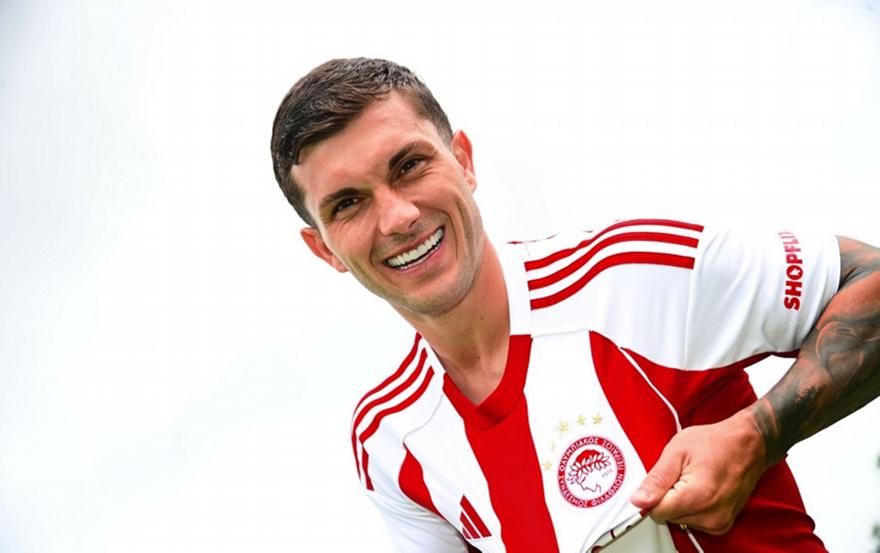 Αποτελεί, μάλιστα, τον πρώτο ποδοσφαιριστή που φορά τη νέα φανέλα του Ολυμπιακού, την οποία παρουσίασε σήμερα ο σύλλογος.