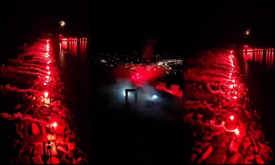 Οι φίλοι των «ερυθρόλευκων» κοκκίνισαν τη Νάξο, κάνοντας τη νύχτα-ημέρα με δεκάδες καπνογόνα και πυροτεχνήματα.