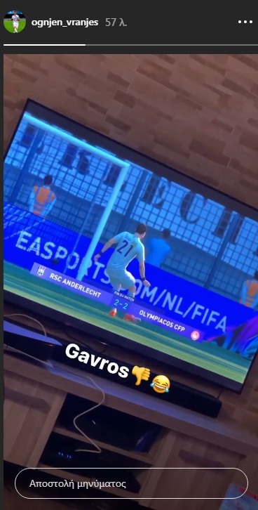 Ο Βόσνιος ανέβασε ένα story στο instagram με στιγμιότυπο από παιχνίδι Άντερλεχτ-Ολυμπιακός στο FIFA.