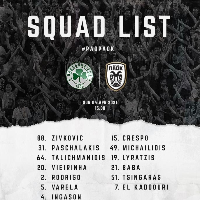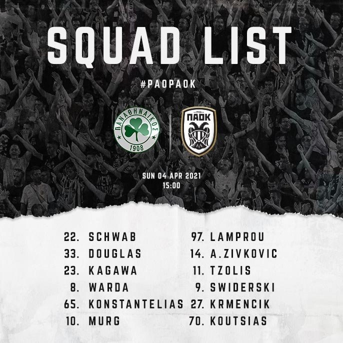 Αναλυτικά η αποστολή: Ζίβκοβιτς, Πασχαλάκης, Ταλιχμανίδης, Βιεϊρίνια, Ροντρίγκο, Βαρέλα, Ίνγκασον, Κρέσπο, Μιχαηλίδης, Λύρατζης, Μπάμπα, Τσιγγάρας, Ελ Καντουρί, Σβαμπ, Ντόουγκλας, Καγκάβα, Ουάρντα, Κωνσταντέλιας, Μουργκ, Λάμπρου, Α.Ζίβκοβιτς, Τζόλης, Σφιντέρσκι, Κρμέντσικ, Κούτσιας.