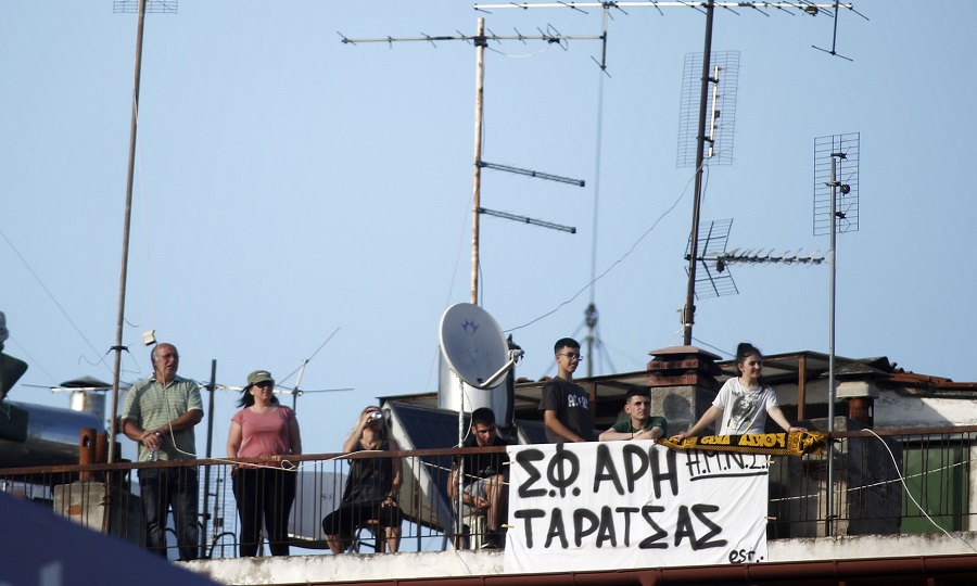 Μάλιστα, μια παρέα έχει αναρτήσει ένα πανό -όπως και στο ματς Κυπέλλου με την ΑΕΚ- που γράφει Σύνδεσμος Φίλων Άρης Ταράτσας.