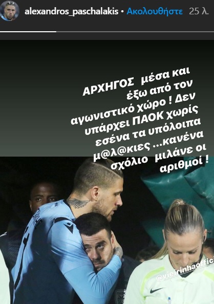 «Αρχηγός μέσα και έξω από τον αγωνιστικό χώρο! Δεν υπάρχει ΠΑΟΚ χωρίς εσένα, τα υπόλοιπα μ.....ς. Κανένα σχόλιο, μιλάνε οι αριθμοί», έγραψε στο Instagram.