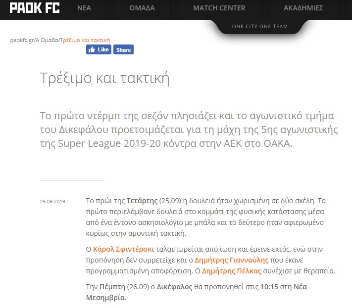 «Το πρώτο ντέρμπι της σεζόν πλησιάζει και το αγωνιστικό τμήμα του Δικεφάλου προετοιμάζεται για τη μάχη της 5ης αγωνιστικής της Super League 2019-20 κόντρα στην ΑΕΚ στο ΟΑΚΑ», αναφέρεται στο Δελτίο Τύπου για τη σημερινή προπόνηση.