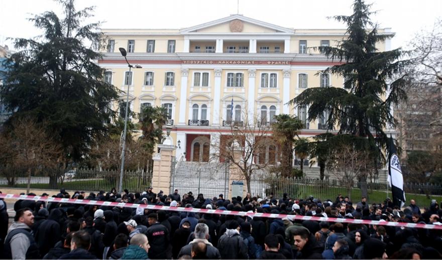Το απόγευμα της Παρασκευής οπαδοί του «δικέφαλου του Βορρά» συγκεντρώθηκαν έξω από το Υπουργείο Μακεδονίας-Θράκης. Ανάμεσα στο πλήθος βρίσκονταν και παλαίμαχοι του συλλόγου.