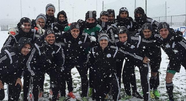 Και οι παίκτες του Παναθηναϊκού που αντίκρισαν το πρωί της Τετάρτης κατάλευκο το προπονητικό κέντρο στο Κορωπί, δεν έχασαν την ευκαιρία να ποζάρουν για μια ομαδική φωτογραφία.
