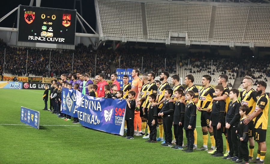 Με το κλασικό 4-2-3-1 παρέταξε την ομάδα του ο Νίκος Κωστένογλου. Κάτω από τα δοκάρια για την ΑΕΚ ήταν ο Μπάρκας, με τους Μπακάκη, Βράνιες, Σβάρνα, Λόπες να αποτελούν την τετράδα της άμυνας. Σιμάο, Σιμόες το δίδυμο στον άξονα, ενώ στην μεσοεπιθετική τριπλέτα βρίσκονταν οι Βέρντε, Μάνταλος, Ντέλετιτς. Μοναδικός προωθημένος ήταν ο Ολιβέιρα.