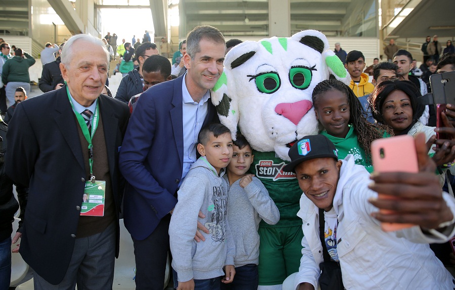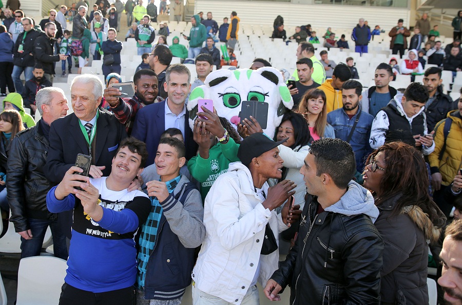 Μάλιστα φωτογραφήθηκε με παιδιά διαφόρων εθνικοτήτων, καθώς στις κερκίδες φιλοξενήθηκαν 100 μετανάστες, ενώ 22 παιδιά μεταναστών συνόδευσαν τους παίκτες των δύο ομάδων στον αγωνιστικό χώρο.