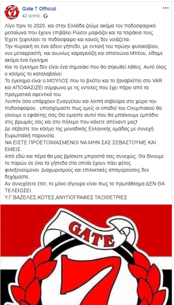 Λοιπόν όσο υπάρχουν Ευαγγέλου και λοιπή σαβούρα στο χώρο του ποδοσφαίρου , υποσχόμαστε πως εμείς οι οπαδοί του Ολυμπιακού θα γίνουμε ο εφιάλτης σας.Θα ειμαστε αυτοί που θα μπαίνουμε εμπόδιο στις βρωμιές σας και στο πόλεμο που κάνετε απέναντι μας!