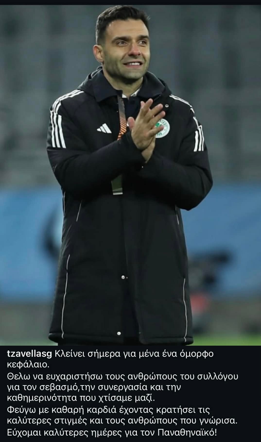 «Κλείνει σήμερα για μένα ένα όμορφο κεφάλαιο. Θέλω να ευχαριστήσω τους ανθρώπους του συλλόγου για τον σεβασμό, τη συνεργασία και την καθημερινότητα που χτίσαμε μαζί. Φεύγω με καθαρή καρδιά έχοντας κρατήσει τις καλύτερες στιγμές και τους ανθρώπους που γνώρισα. Εύχομαι καλύτερες ημέρες για τον Παναθηναϊκό», έγραψε.