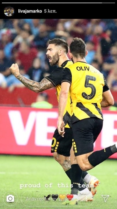 Υπερήφανος δηλώνει ο Μάρκο Λιβάγια για την ΑΕΚ και τους συμπαίκτες του για την εμφάνιση και τη νίκη της στην Τουρκία απέναντι στην Τραμπζονσπόρ.