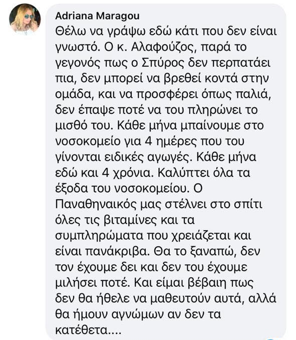Η σύζυγος του παλαίμαχου άσου, με ποστάρισμα της στα social media, αποκάλυψε ότι ο ιδιοκτήτης της ΠΑΕ όλο αυτό το διάστημα στηρίζει τον τον Σπύρο Μαραγκό και την οικογένεια του, χωρίς να θέλει να μαθευτεί η προσφορά του.