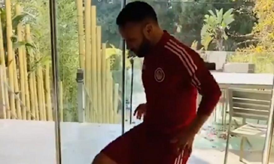 Γκελάκια με ένα ρολό χαρτί και ο άσος του Ολυμπιακού, Ματιέ Βαλμπουενά, ο οποίος κάνει ατομικές προπονήσεις στο σπίτι του λόγω των περιορισμών που υπάρχουν εξαιτίας του κορωνοϊού.
