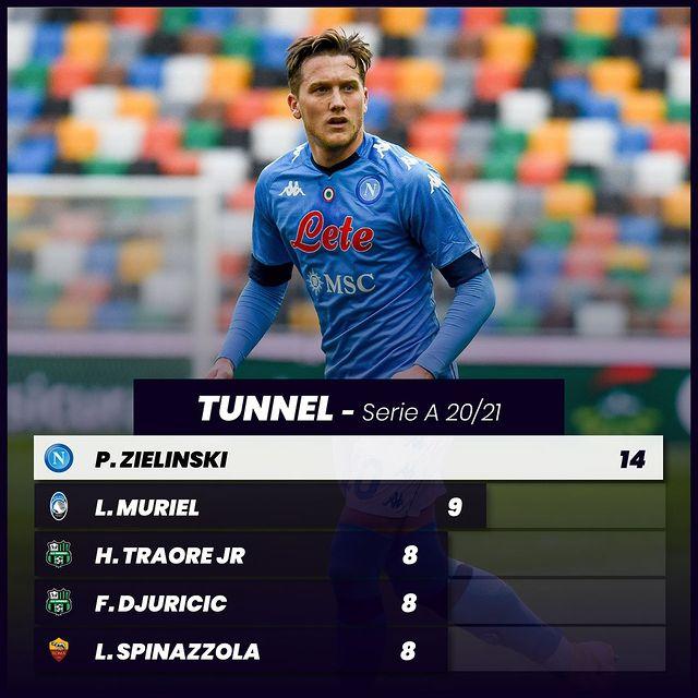 Ένας από τους πιο εντυπωσιακούς ποδοσφαιριστές και με εξαιρετικά τεχνικά χαρακτηριστικά είναι ο Πιοτρ Ζιελίνσκι. Ο χαφ της Νάπολι είναι και ο πρώτος σε ποδιές (ή τούνελ εάν προτιμάτε) στην Serie A με 14, ενώ ακολουθεί ο Μουριέλ με 9 και οι Τραορέ, Τζούριτσιτς, Σπινατσόλα με 8.