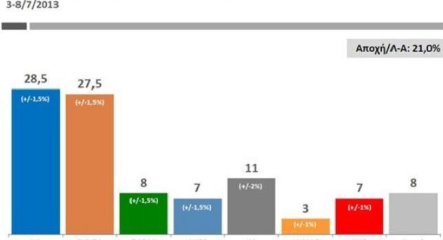 Ως προς τις μεταβολές στην εκλογική επιρροή, η ΝΔ χάνει σε ένα μήνα 1 ποσοστιαία μονάδα με 28,5% τον Ιούνιο του 2013 και 27,5% τον Ιούλιο του 2013, ο ΣΥΡΙΖΑ παραμένει σταθερός στο 27,5%, το ΠΑΣΟΚ καταγράφει άνοδο 1,5% (από 6,5% στο 8%), οι ΑΝΕΛ σημειώνουν άνοδο 1% (από 6% τον Ιούνιο σε 7% τον Ιούλιο), η ΧΑ μείωση 0,5% (από 11,5% στο 11%), η ΔΗΜΑΡ πτώση 1,5% (από 4,5% στο 3%), το ΚΚΕ άνοδο 1 ποσοστιαίας μονάδας (από 6% στο 7%) και τα υπόλοιπα κόμματα καταγράφουν πτώση 0,5% (από 8,5% τον Ιούνιο στο 8% τον Ιούλιο). Η ΝΔ έχει κερδίσει σε εκτίμηση επιρροής 2,5% από το Σεπτέμβριο του 2012 ώς τον Ιούλιο του 2013 (από 26% σε 28,5% με ανώτερο σημείο το 29,5% του Ιουνίου), ενώ ο ΣΥΡΙΖΑ έχει απολέσει το ίδιο χρονικό διάστημα 3%, (από 30,5% σε 27,5%).