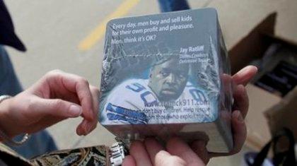 «Ως άντρας και πατέρας δύο κοριτσιών, δεν αγοράζω και το ίδιο θα πρέπει να κάνετε κι εσείς. Αν είστε ένας από αυτούς που αγοράζουν νεαρά κορίτσια, οφείλετε να ξέρετε ότι οι πραγματικοί άντρες δεν πληρώνουν για σεξ. Δεν αγοράζουν γυναίκες», λέει σε τηλεοπτικό σποτ –ένα από τα πολλά με πρωταγωνιστές παίκτες του NFL- ο Τζέι Ράτκλιφ που αγωνίζεται στο Ντάλας.