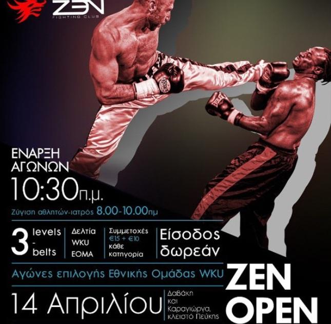 Την Κυριακή 14 Απριλίου, στο κλειστό της Πεύκης, θα γίνουν οι προκριματικοί αγώνες στο ZEN OPEN 2013 (ZEN FIGHTING CLUB), όπου Έλληνες αθλητές θα διεκδικήσουν την συμμετοχή τους στο παγκόσμιο πρωτάθλημα WKU.