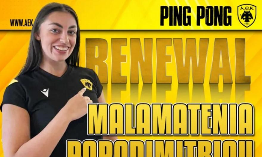 Πινγκπονίστρια της ΑΕΚ παραμένει η Μαλαματένια Παπαδημητρίου. Η Ένωση ανακοίνωσε την ανανέωση της συνεργασίας της με την 21χρονη διεθνή σταρ για τα επόμενα τρία χρόνια μετά τους τίτλους που κατέκτησε πέρυσι στην πρώτη της χρονιά με τα κιτρινόμαυρα.