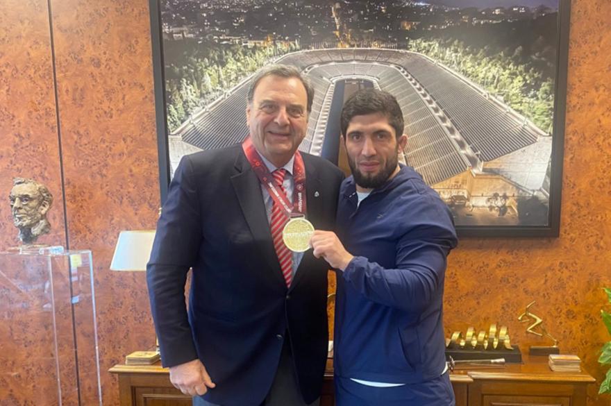 Στη συνάντηση ήταν μαζί και ο Ολυμπιονίκης και εκπρόσωπος της πάλης στην Ελληνική Ολυμπιακή Επιτροπή Κώστας Θάνος, ενώ ο Νταουρέν Κουρουγκλίεβ για να ευχαριστήσει τον κ. Κούβελο για την πρόσκληση στην ΕΟΕ πέρασε στο λαιμό του το χρυσό μετάλλιο.