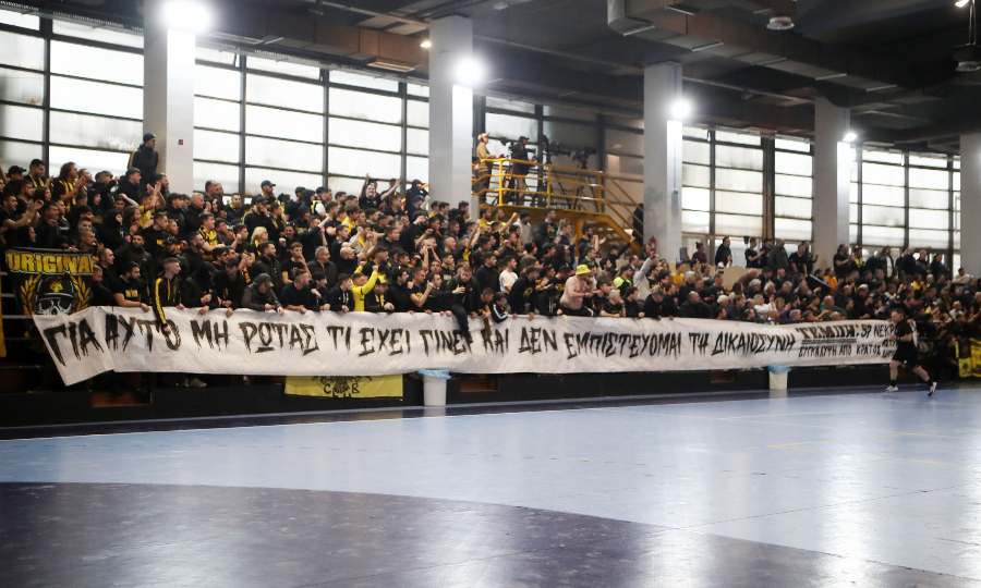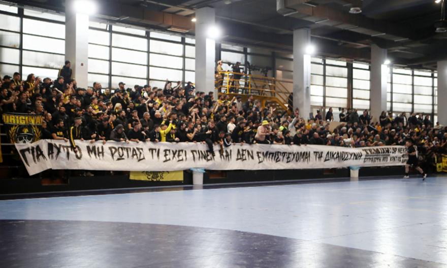 Όπως έχει συμβεί κατά καιρούς σε πολλά γήπεδα της χώρας μας, έτσι και στο αποψινό ντέρμπι στο χάντμπολ ανάμεσα σε ΑΕΚ και Ολυμπιακό, οι φίλοι της «Ένωσης» ανήρτησαν πανό στο «Γιώργος Κασιμάτης» με ξεκάθαρο μήνυμα για τη δικαιοσύνη που δεν έρχεται...