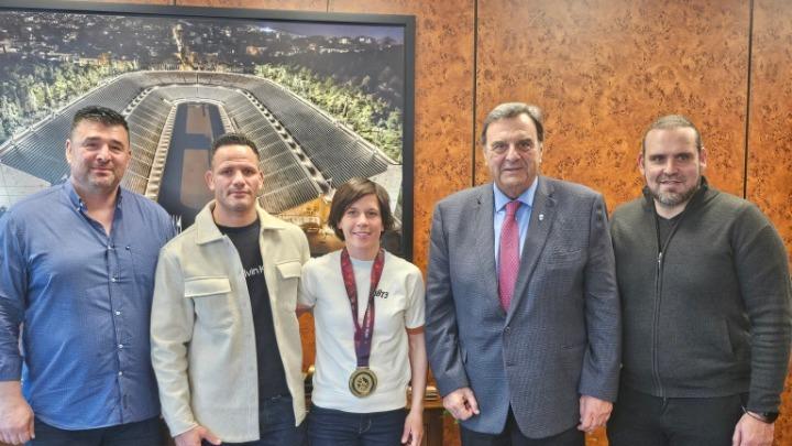 Η Πρεβολαράκη ευχαρίστηκε τον κ. Κούβελο για τα θερμά λόγια και τη στήριξη της ΕΟΕ. Στη συνάντηση παρέστη εκ μέρους της Ελληνικής Ομοσπονδίας Πάλης ο αναπληρωτής πρόεδρος, Δημήτρης Τραμπάκουλας.