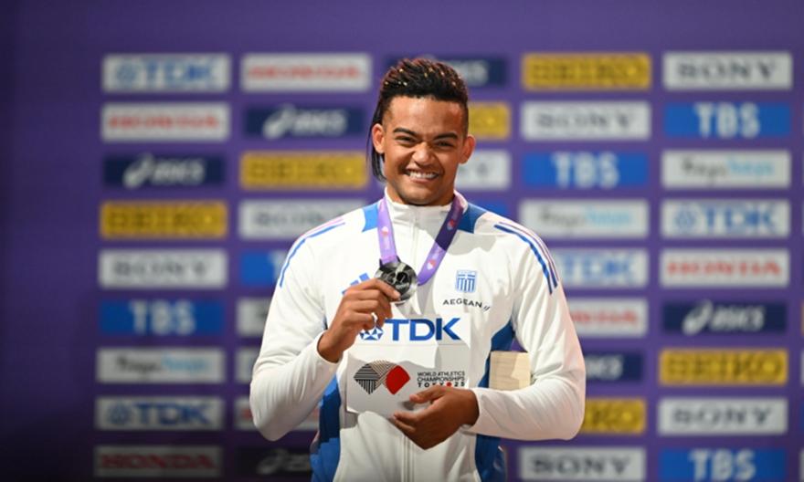 Ο Έλληνας πρωταθλητής, όπως πάντα χαμογελαστός, παρέλαβε σήμερα το ασημένιο μετάλλιο στο άλμα επί κοντώ για το Παγκόσμιο Πρωτάθλημα Στίβου στην Ιαπωνία.
