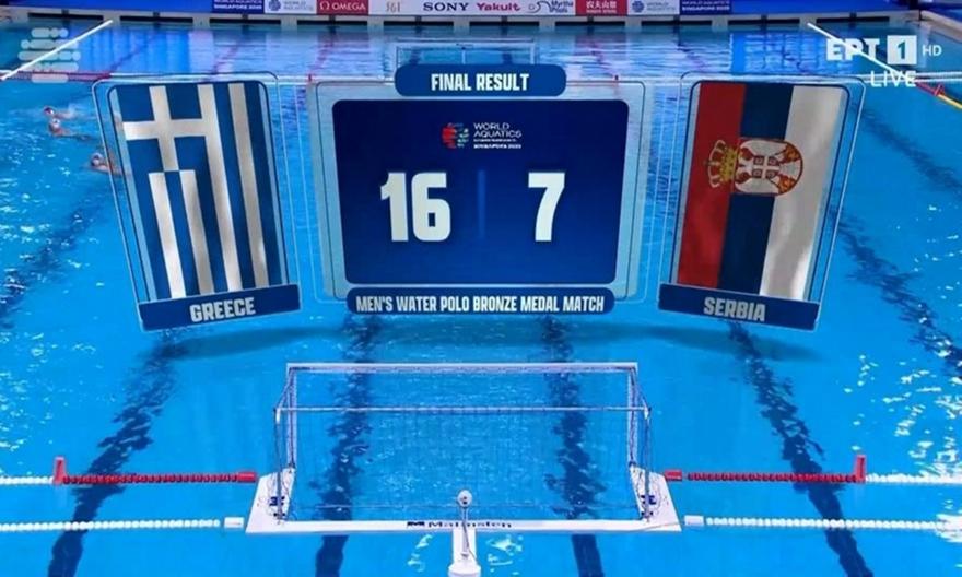 Με μια μεγαλειώδη εμφάνιση η Εθνική ομάδα πόλο ανδρών επικράτησε άνετα 16-7 της Σερβίας στον μικρό τελικό και κατέκτησε την τρίτη θέση στο Παγκόσμιο Πρωτάθλημα στη Σιγκαπούρη.