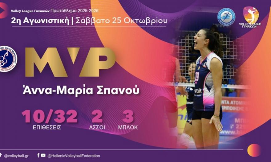 Η Άννα-Μαρία Σπανού αναδείχθηκε κορυφαία αθλήτρια της δεύτερης αγωνιστικής της Volley League γυναικών που ολοκληρώθηκε την περασμένη Κυριακή. Η ακραία του Μαρκόπουλου είχε ουσιαστική συμβολή σε επίθεση, μπλοκ, σερβίς κι υποδοχή και βοήθησε την ομάδα των Μεσογείων να κάνει τη μεγάλη έκπληξη κόντρα στον Ολυμπιακό με 3-2 σετ το περασμένο Σάββατο.