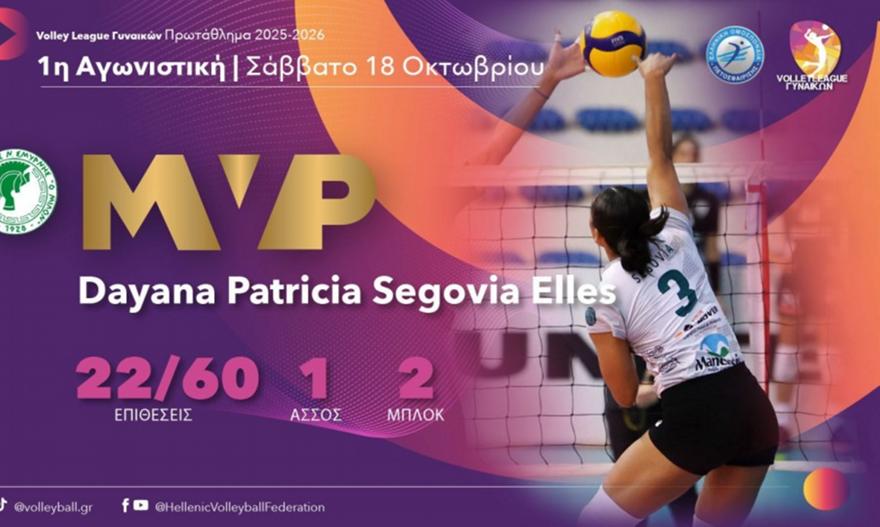 Η Νταϊάνα Σεγκόβια είναι η κορυφαία αθλήτρια της πρεμιέρας της Volley League γυναικών. Η Κολομβιανή διαγώνια του Μίλωνα ήταν η πρωταγωνίστρια του 3-2 σετ των Νεοσμυρνιώτισσων στη Θεσσαλονίκη επί του ΠΑΟΚ στην έκπληξη της ημέρας. Στη συγκεκριμένη αναμέτρηση, η Σεγκόβια πέτυχε 25 πόντους με 22/60 επιθέσεις, 1 άσσο, 2 μπλοκ.