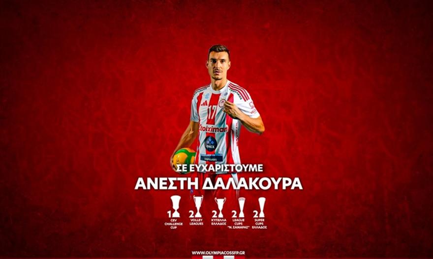 «Ο ΟΛΥΜΠΙΑΚΟΣ Σ.Φ.Π. ευχαριστεί θερμά τον Ανέστη Δαλακούρα για την πολύτιμη προσφορά του στην ομάδα βόλεϊ Ανδρών του συλλόγου. Ο Ανέστης Δαλακούρας ολοκληρώνει την αγωνιστική του πορεία, αφήνοντας πίσω του μια σημαντική παρακαταθήκη ήθους, αφοσίωσης και επιτυχιών.