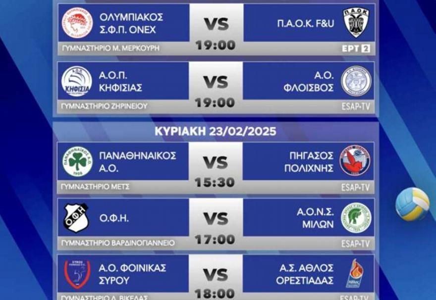 Γυμναστήριο Ζηρινείου, 19.00 (Live Streaming ESAP T.V. You Tube): Α.Ο.Π. Κηφισιάς - Α.Ο. Φλοίσβος Διαιτητές: Γεροθόδωρος, Μουλά Λ., Παρατηρητής: Ράπτης, Επόπτες: Καπότης, Παυλάκης, Γραμματεία: Μπίτσικα.