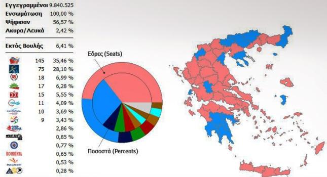 Η πρωτιά ανήκει φυσικά στο ΣΥΡΙΖΑ, ο οποίος έλαβε τελικά 35,46% και 145 έδρες, με τη Νέα Δημοκρατία να περιορίζεται στο 28,10 % και τις 75 έδρες.