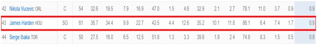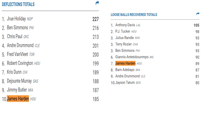 Ο 30χρονος σκόρερ λατρεύει να έχει την μπάλα στα χέρια του και τα τελευταία χρόνια ιδρώνει και στην άμυνα για να την αποκτήσει. Ο Χάρντεν για άλλη μια χρονιά βρίσκεται πολύ ψηλά στη λίστα με τα κλεψίματα. Φέτος είναι ο τρίτος καλύτερος «κλέφτης» με 106 συνολικά.