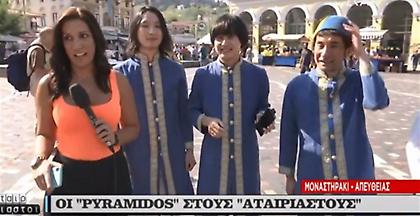 Με πολύχρωμες πυραμίδες στο κεφάλι, κέφι, χορό και το «Βρε μελαχρινάκι» καλημέριζαν σήμερα τους Αθηναίους που βρέθηκαν στο Μοναστηράκι οι Pyramidos!